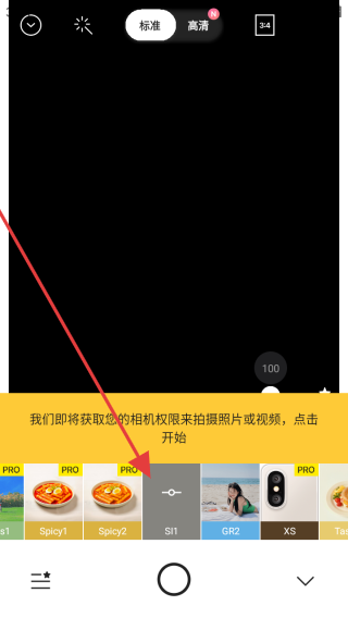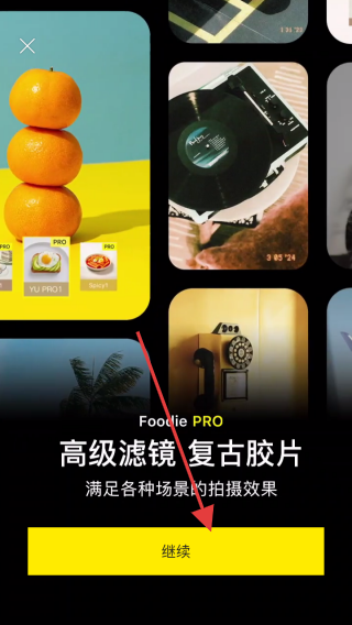 1、在Foodie PRO濾鏡介紹頁(yè),點(diǎn)擊黃色繼續(xù)按鈕,進(jìn)入相機(jī)功能界面。