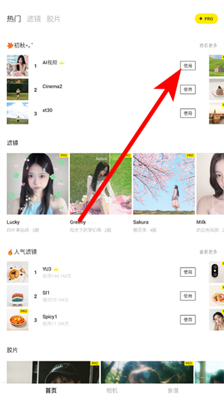 2、在首頁(yè)中選擇熱門、濾鏡、膠片等分類下的特效模板,如初秋等,點(diǎn)擊使用按鈕應(yīng)用該模板。