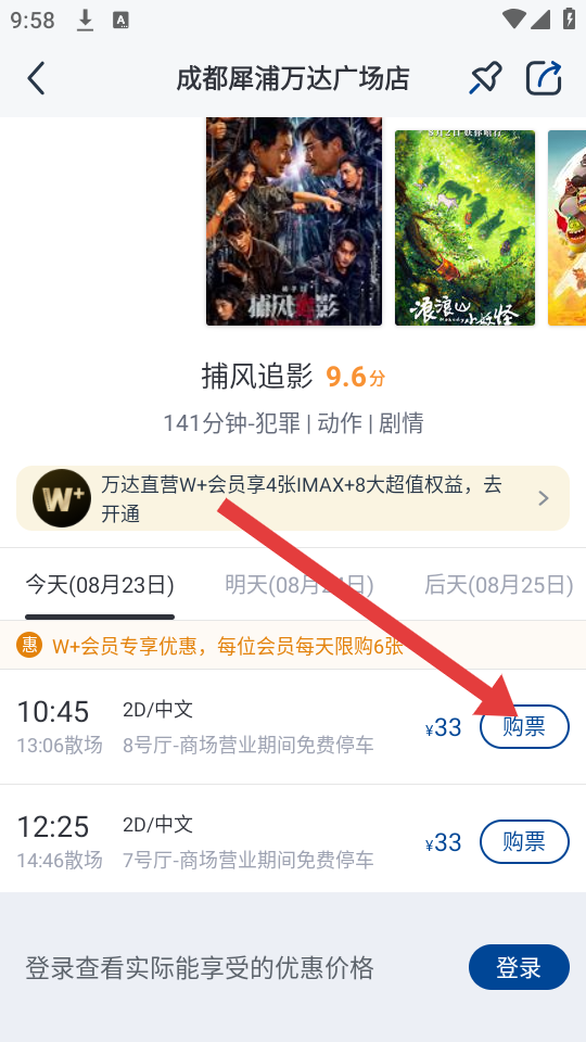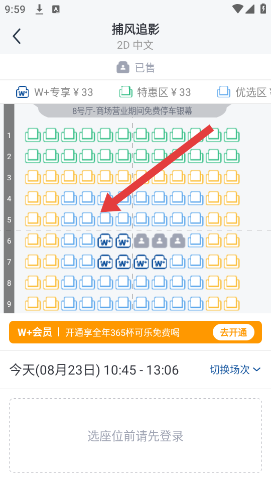 2、在影片的詳情頁(yè),需要選擇具體觀影場(chǎng)次,點(diǎn)擊場(chǎng)次右側(cè)的購(gòu)票按鈕,進(jìn)入座位選擇界面。
