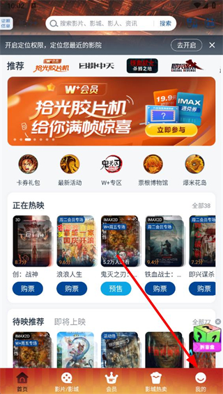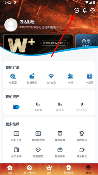 1、打開(kāi)萬(wàn)達(dá)電影app,在首頁(yè)點(diǎn)擊右下角我的選項(xiàng),進(jìn)入個(gè)人頁(yè)面。