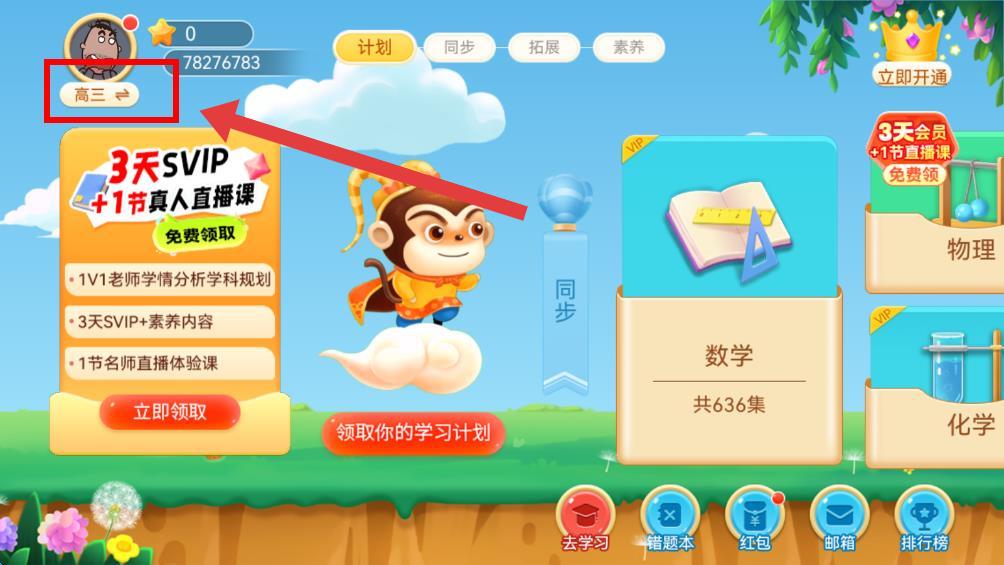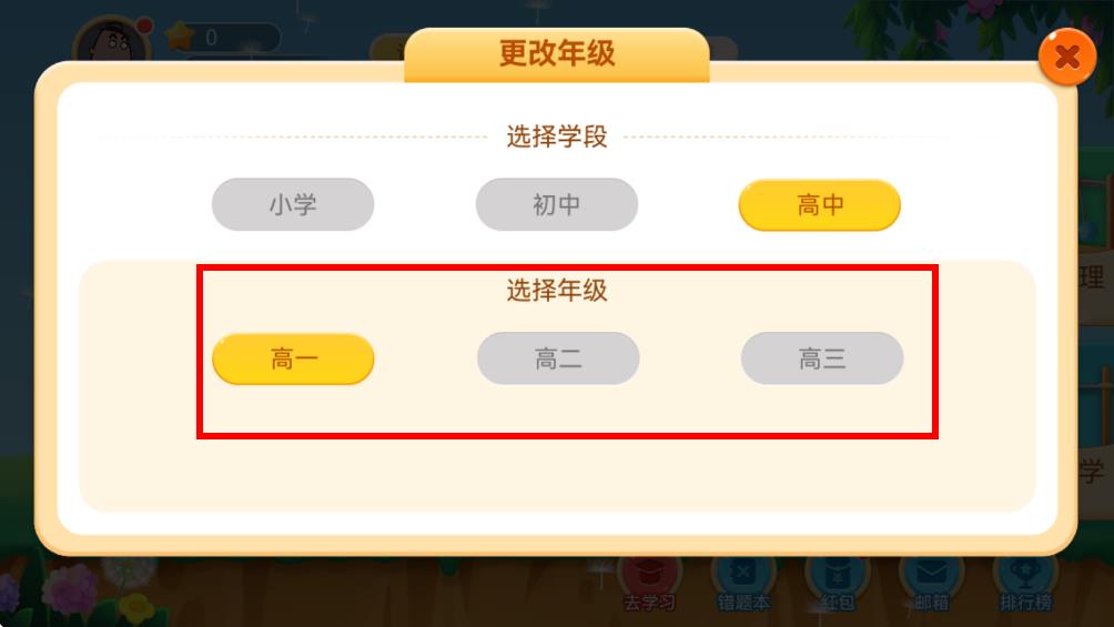 3、確定學(xué)段后,在下方選擇年級板塊中,點擊對應(yīng)的年級按鈕,比如選擇高中段后可點擊高一、高二、高三中的一個,即可完成年級切換。