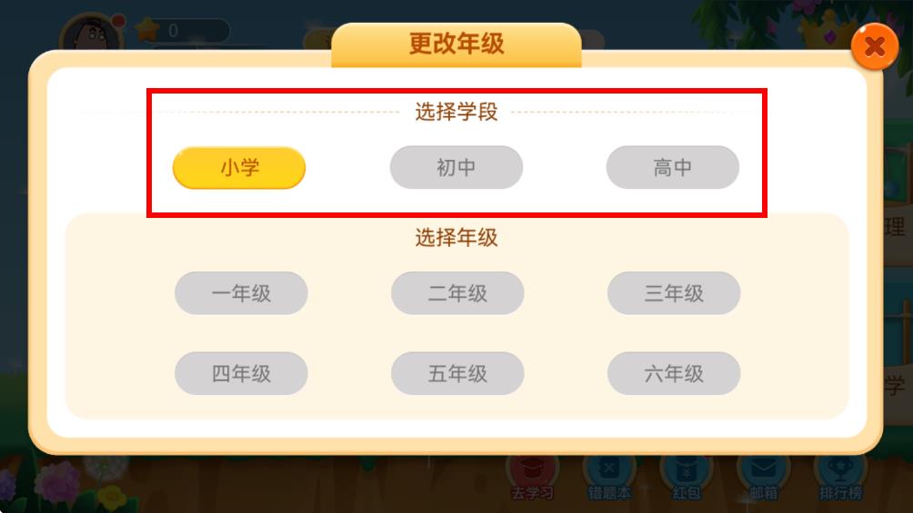 2、在更改年級界面的選擇學(xué)段板塊,根據(jù)需求點擊小學(xué)、初中、或高中按鈕,確定學(xué)段。