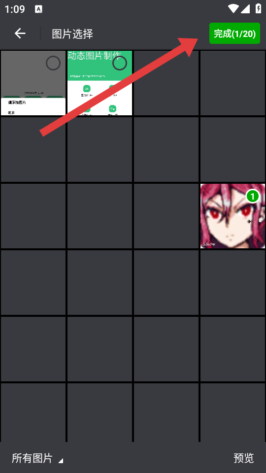 3、在圖片選擇界面,勾選圖片后點擊右上角完成,進(jìn)入動態(tài)圖編輯頁面。
