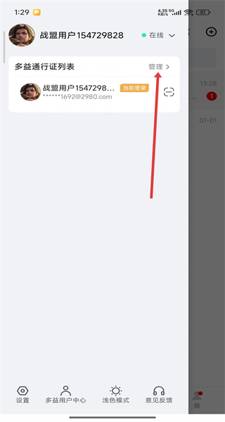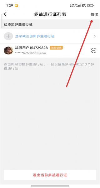 2、在多益通行證列表頁面點(diǎn)擊“管理”,進(jìn)入管理模式。