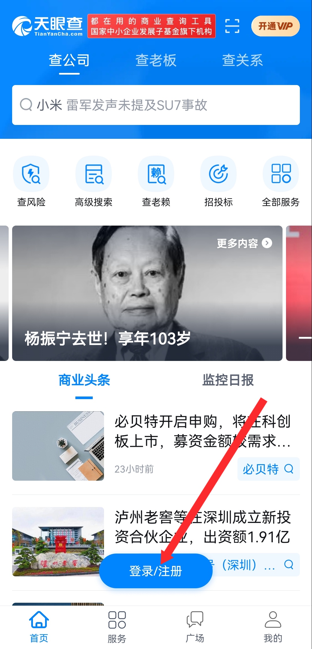 1、在天眼查的首頁,需要點擊登錄/注冊的按鈕,進(jìn)入登錄界面。