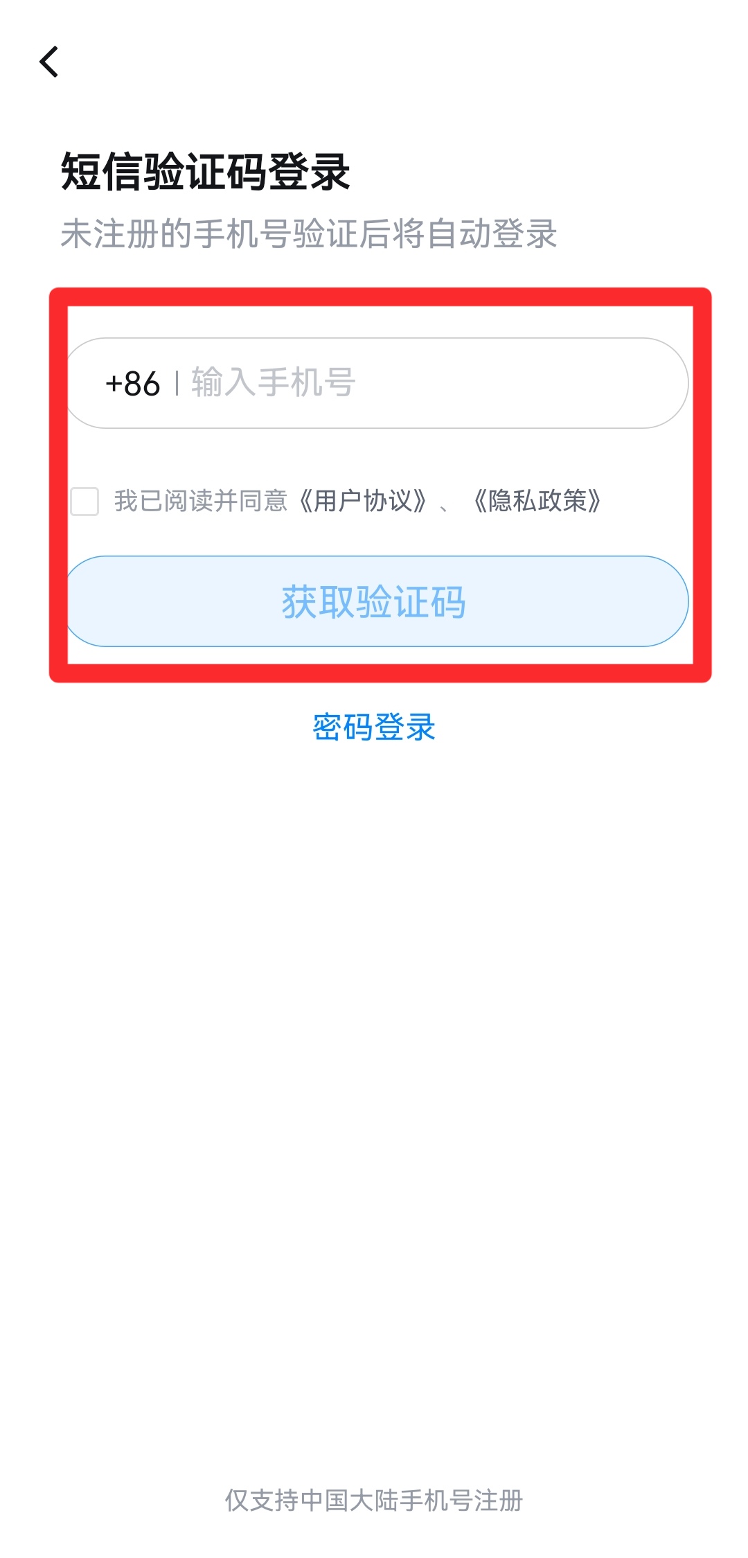 3、在短信驗證碼登錄頁面,輸入手機號,勾選協(xié)議后點擊獲取驗證碼。