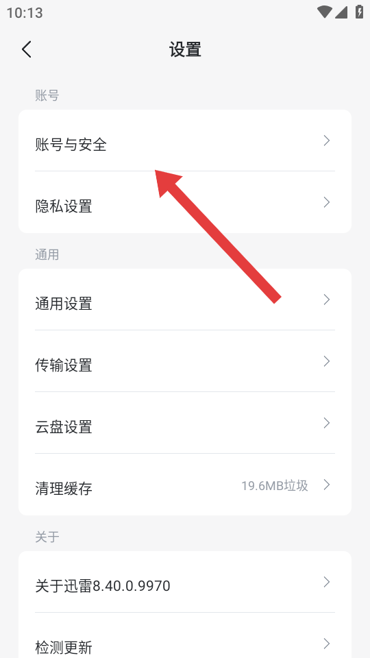1、打開迅雷APP,進(jìn)入個人賬號設(shè)置的頁面,點(diǎn)擊賬號與安全的選項(xiàng),進(jìn)入賬號安全設(shè)置界面。