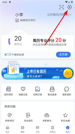 1、打開(kāi)俊才網(wǎng)app,在我的頁(yè)面點(diǎn)擊右上角的設(shè)置圖標(biāo),進(jìn)入設(shè)置頁(yè)面。