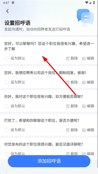 4、在設(shè)置招呼語(yǔ)頁(yè)面可選擇已有招呼語(yǔ)編輯、刪除或設(shè)為默認(rèn),也可添加新招呼語(yǔ)。