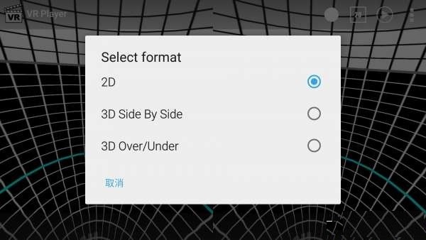 右上角第一個(gè)選項(xiàng):看“360度VR視頻”時(shí)選擇“2D”,看“3D左右視頻”時(shí)選擇“3D Side By Side”,看3D上下視頻時(shí)選擇最后一個(gè)。