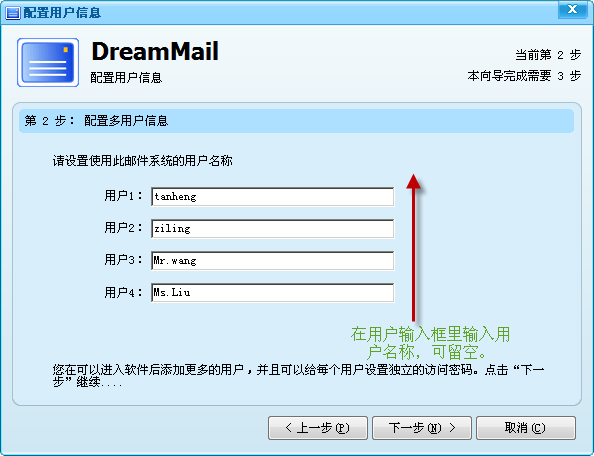 2、點(diǎn)擊下一步,進(jìn)入用戶名稱配置,最多可以輸入四個用戶使用,如圖示: