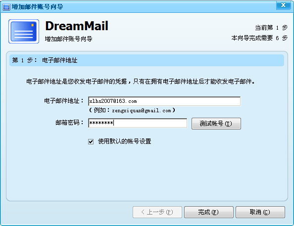 輸入正確的地址和密碼,測試賬號,OK。點(diǎn)完成就可以進(jìn)入主界面接受郵件了。