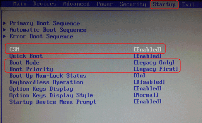 進(jìn)入“Startup”,將“CSM”(兼容支持模塊)設(shè)置成“Enabled”,將“Boot Mode”設(shè)置成“Legacy Only”,將“Boot Priority”設(shè)置成“Legacy First”。