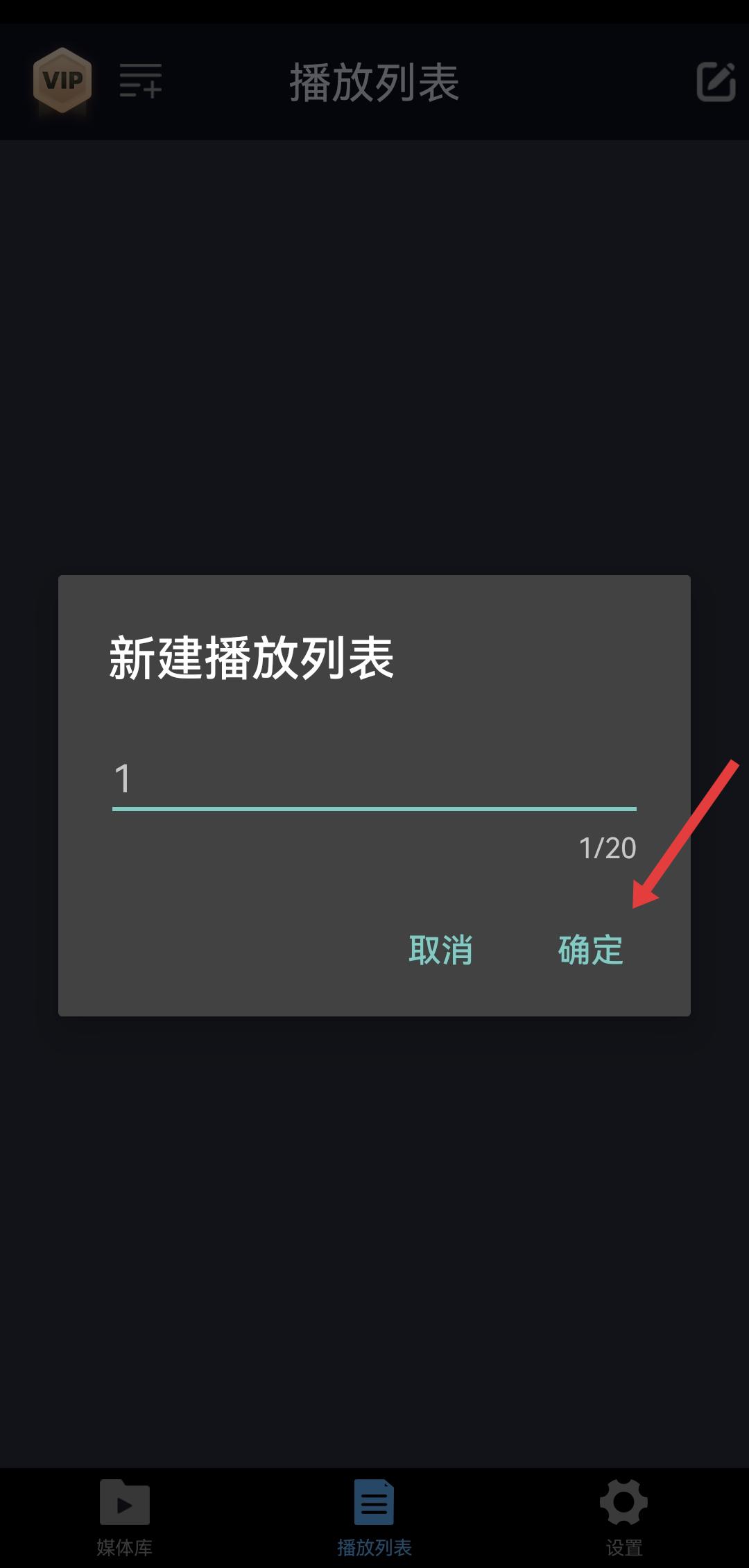 2、在彈出的彈窗中,輸入播放列表名稱后點(diǎn)擊確定,完成播放列表創(chuàng)建。