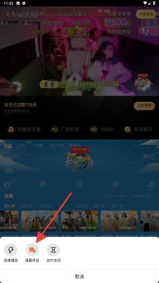 3、在底部彈出的控制欄中,點擊彈幕開啟的圖標(biāo),即可開啟彈幕。