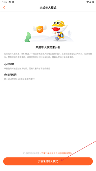 4、進(jìn)入未成年模式的界面內(nèi),點擊下方開啟未成年人模式。