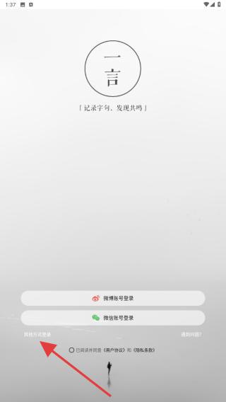 1、打開一言app,若未登錄,一進(jìn)入會(huì)顯示登錄方式,點(diǎn)擊左下角其他方式登錄。