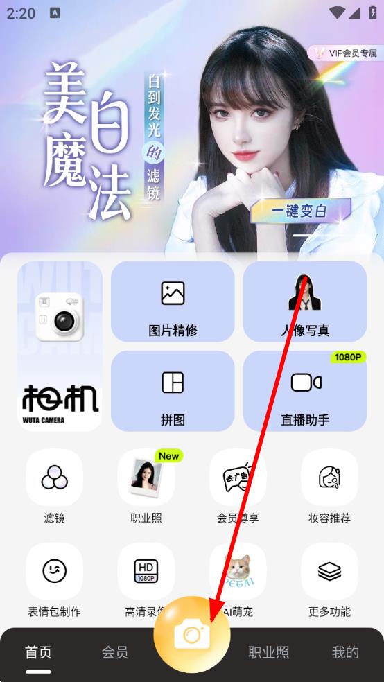 1、打開無他相機應用,點擊底部中間的相機圖標,進入拍攝界面。