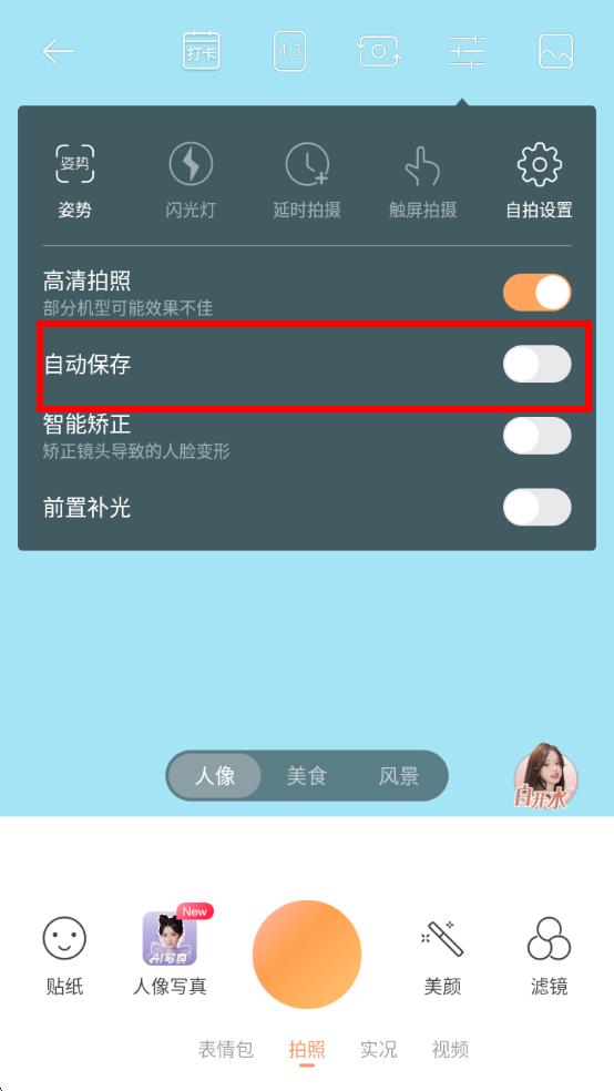 3、在展開的拍攝設(shè)置選項里,找到自動保存選項,點擊其右側(cè)的按鈕,將其開啟,即可完成無他相機自動保存照片的設(shè)置。