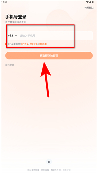 2、進入手機號登錄界面,輸入手機號并點擊獲取短信驗證碼。