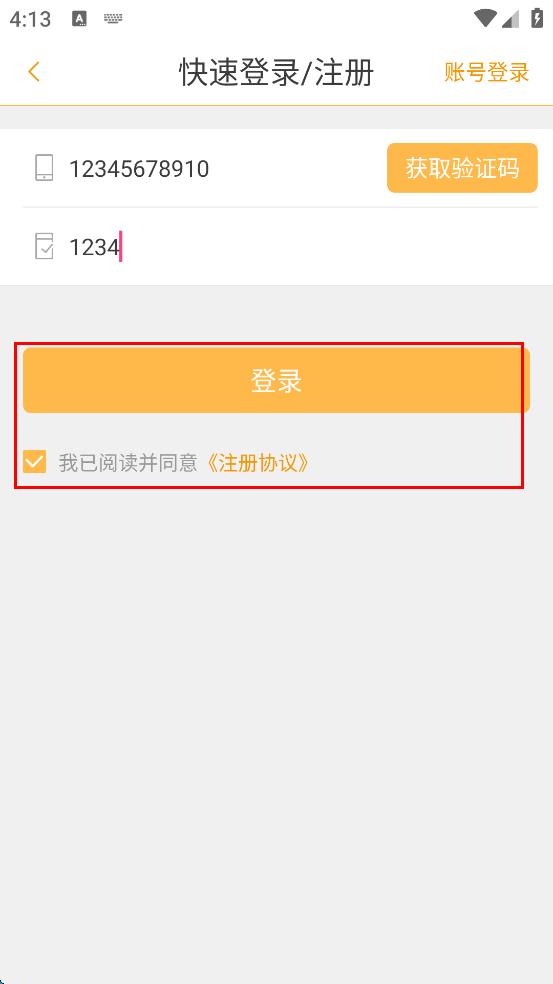 3、進(jìn)入快速登錄/注冊頁面,在手機(jī)號輸入框輸入手機(jī)號,點擊獲取驗證碼,輸入驗證碼。