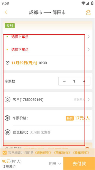 4、在訂單頁面選擇上車點和下車點,確認(rèn)車票數(shù)客戶信息車票價格,點擊去付款完成購票。