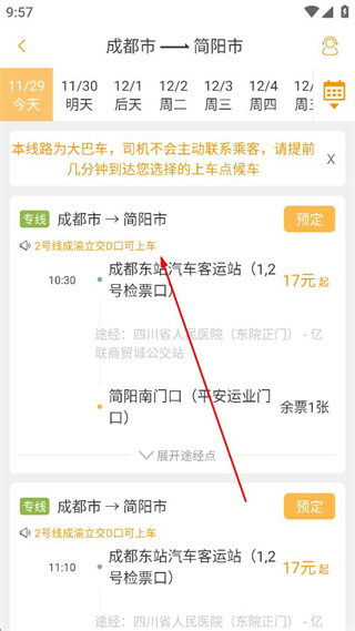 3、在展示的線路列表里,選擇合適的班次,點擊該班次對應(yīng)的預(yù)定按鈕,進(jìn)入訂單確認(rèn)頁面。