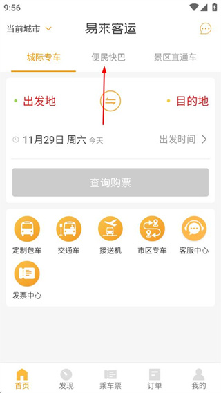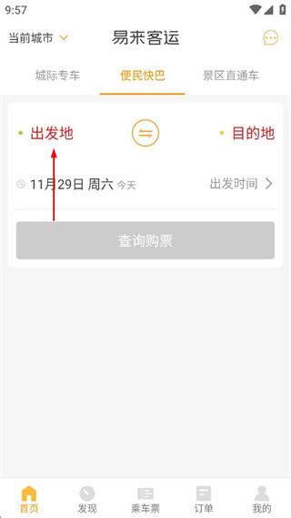 1、打開易來客運,點擊頁面上方的便民快巴選項,點擊出發(fā)地輸入框,準(zhǔn)備填寫出發(fā)地點。