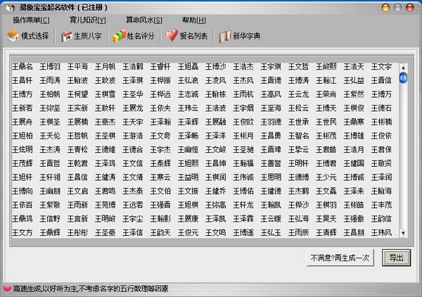 易象起名軟件參考大量書籍、文獻(xiàn)、字典,采用《五行平衡取名法》結(jié)合姓氏、性別、生辰八字、五行、三才、五格、生肖及漢字的音、型、意等重要元素,一次生成數(shù)千個(gè)好名字!您還可以通過設(shè)置筆畫數(shù)、拼音、五行或指定含某字等方式來按照自己的意愿來生成自己滿意的名字!