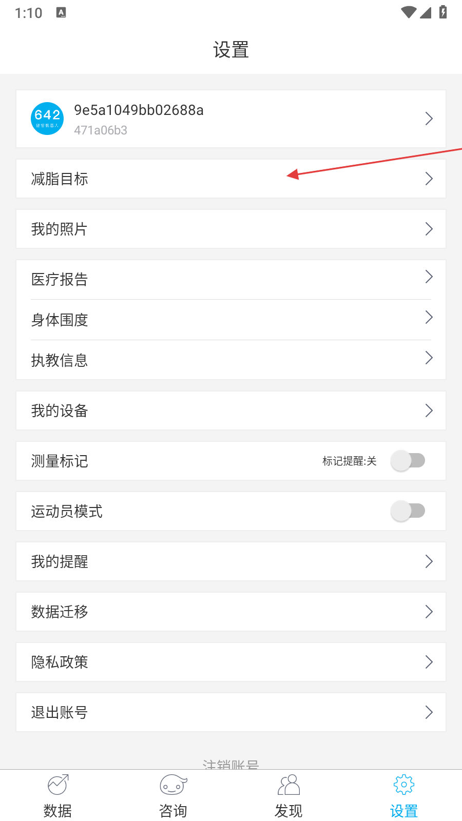 1、打開642健管機(jī)器人應(yīng)用,點(diǎn)擊底部導(dǎo)航欄設(shè)置選項(xiàng)進(jìn)入設(shè)置界面,在列表中找到減脂目標(biāo)并點(diǎn)擊,進(jìn)入減脂目標(biāo)管理頁(yè)面。