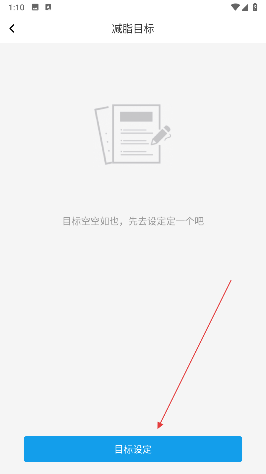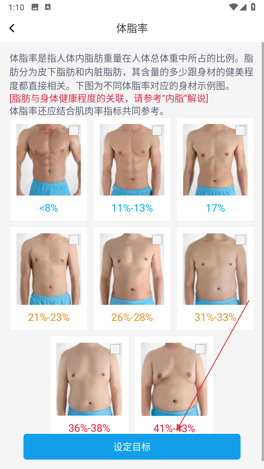 2、進(jìn)入減脂目標(biāo)管理頁(yè)面之后,點(diǎn)擊底部藍(lán)色目標(biāo)設(shè)定按鈕,跳轉(zhuǎn)至體脂率說明界面。