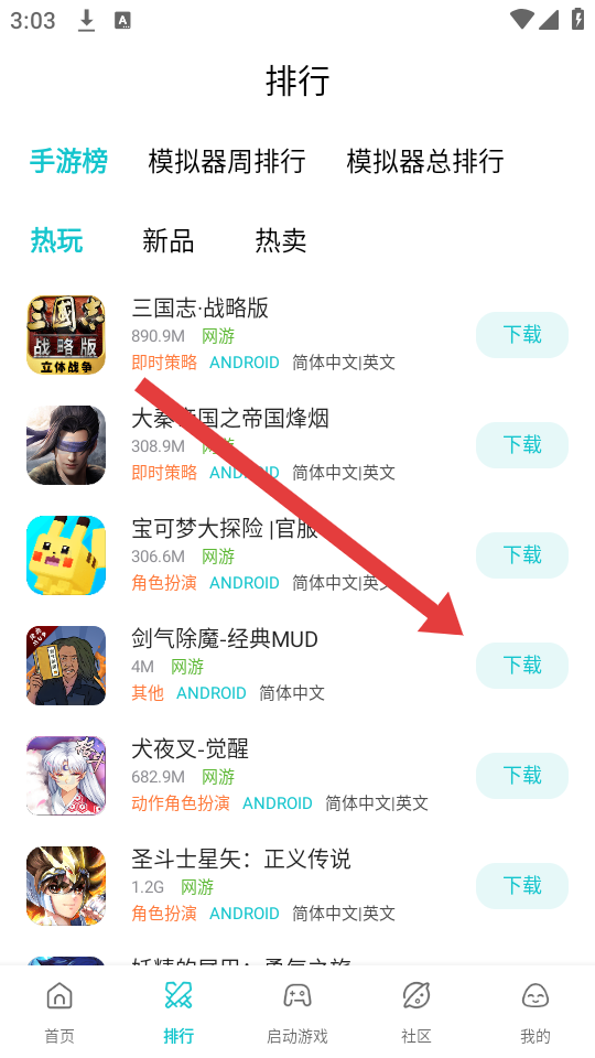 1、若游戲未安裝,先切換到排行頁面,找到目標游戲,點擊右側(cè)下載按鈕安裝,再返回啟動游戲頁面。