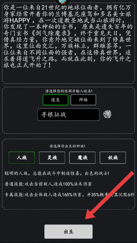 3、使用小雞模擬器進入游戲后,按提示選擇性別、種族等信息,點擊出生按鈕,正式開始游戲的進程。