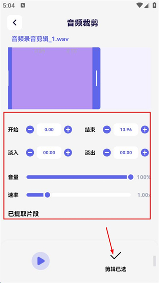 4、在音頻裁剪頁面,設(shè)置參數(shù),點(diǎn)擊剪輯已選按鈕。