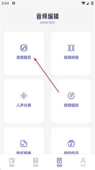 2、在音頻編輯頁面,點(diǎn)擊音頻裁剪選項(xiàng)。