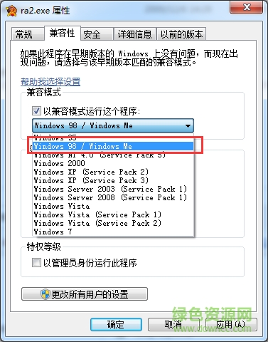 右鍵單擊ra2.exe,選擇“屬性”,在“兼容性”中“選擇98/me的兼容模式即可;