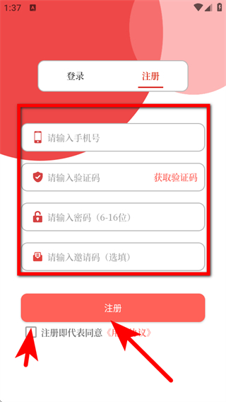 4、依次輸入信息,勾選同意協(xié)議后點擊注冊按鈕,即可完成云上開封app注冊。