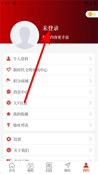 2、在個人頁面,點擊未登錄區(qū)域,進入登錄注冊頁面。