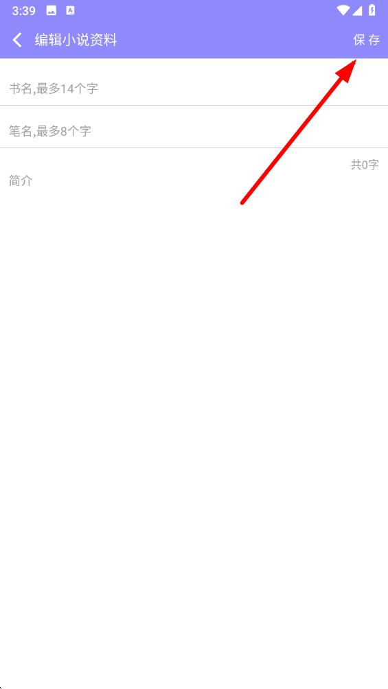 2、在編輯小說資料頁面,輸入書名、筆名、簡介等信息后,點擊右上角保存。