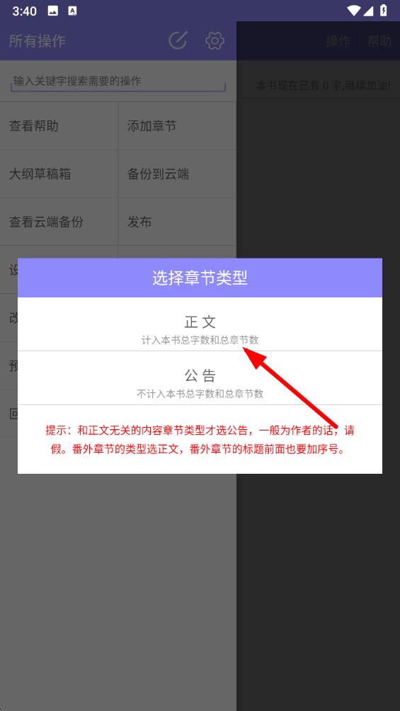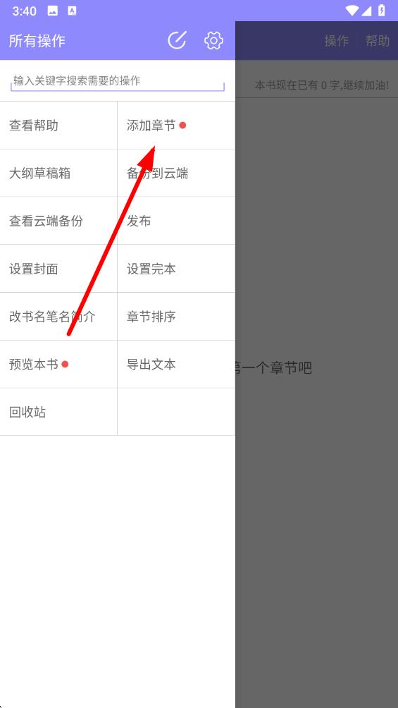 4、在小說的操作頁面,找到并點擊添加章節(jié)選項。