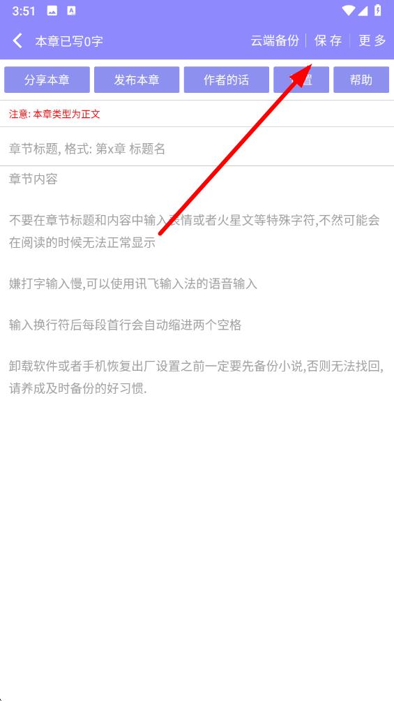 6、在新的頁面輸入章節(jié)標(biāo)題和內(nèi)容進(jìn)行創(chuàng)作后點擊右上角保存即可。