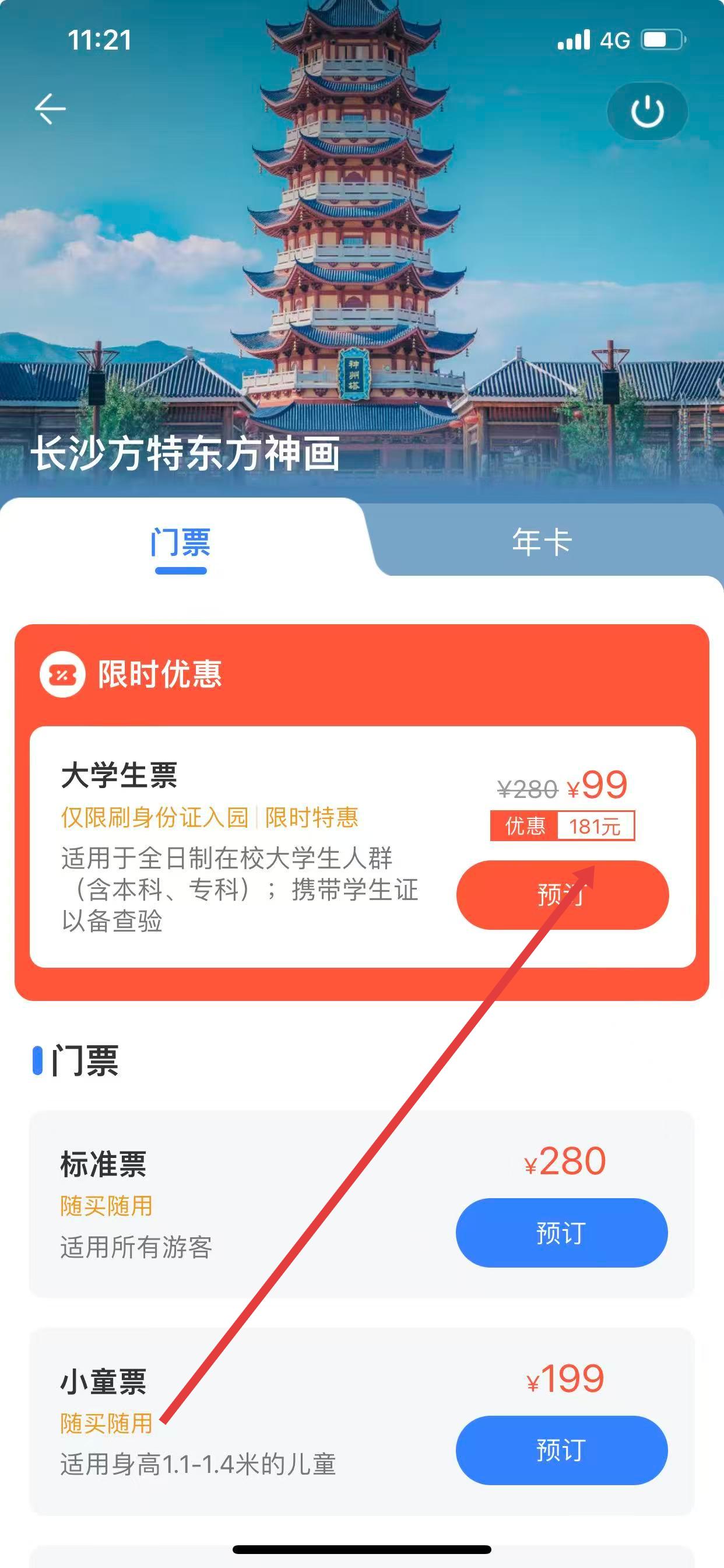 2、進(jìn)入門票頁面后,找到大學(xué)生票,點(diǎn)擊其右側(cè)的預(yù)訂按鈕。