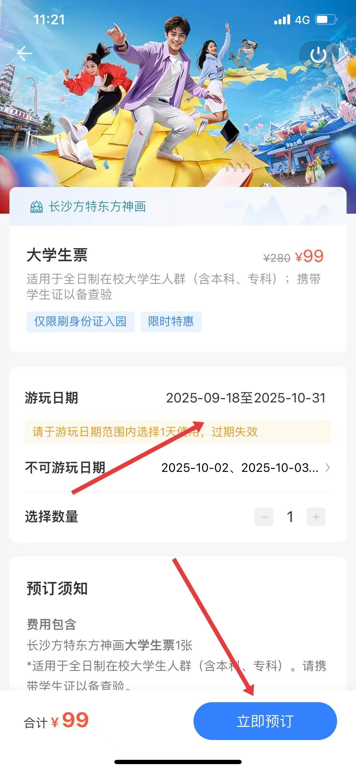 3、在大學(xué)生票詳情頁面,選擇游玩日期,點(diǎn)擊立即預(yù)訂。