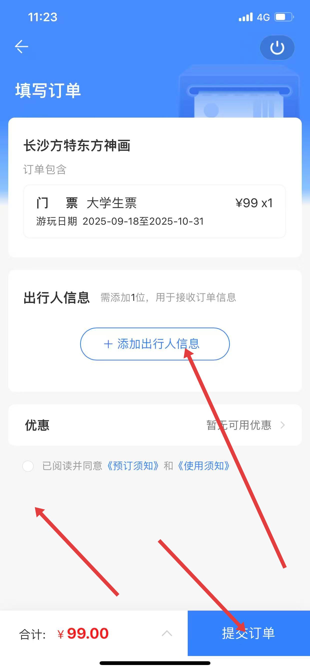 4、在填寫訂單頁面,點(diǎn)擊添加出行人信息,勾選同意《預(yù)訂須知》和《使用須知》,點(diǎn)擊提交訂單完成購票。