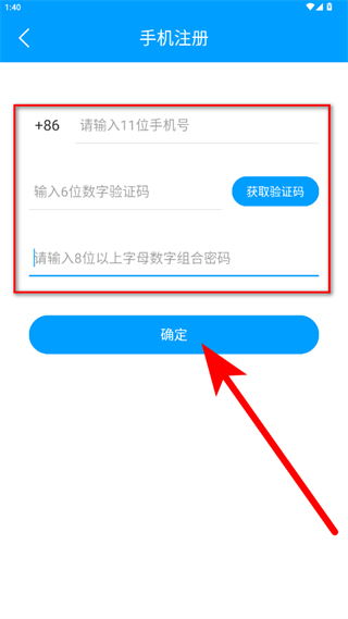 4、在手機(jī)注冊(cè)頁(yè)面填寫手機(jī)號(hào)、獲取并輸入驗(yàn)證碼、設(shè)置密碼,點(diǎn)擊確定,完成賬號(hào)注冊(cè)。