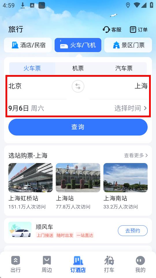 3、在火車票預(yù)訂頁面,設(shè)置出發(fā)地、目的地和出發(fā)時間。