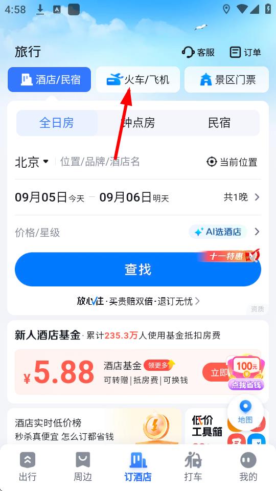2、在旅行界面中,點擊火車/飛機按鈕。