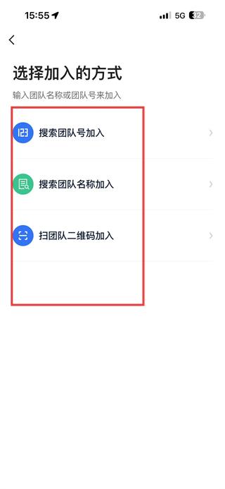 3、進入選擇加入方式頁面后,可選擇搜索團隊號、搜索團隊名稱或掃團隊二維碼加入。