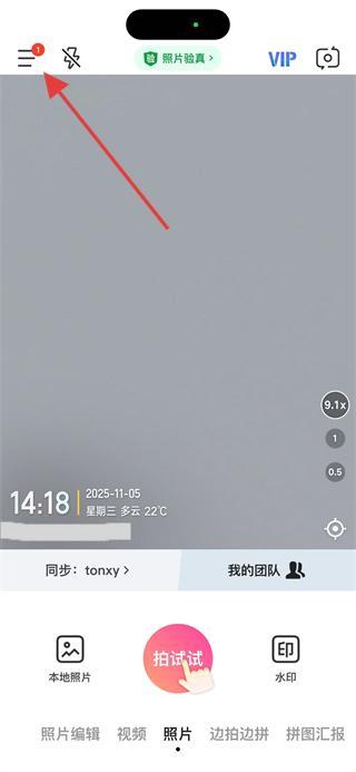 1、打開今日水印相機APP,點擊左上角菜單按鈕,進入功能菜單頁面。