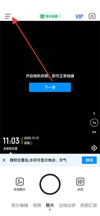 1、打開今日水印相機APP,點擊左上角三條橫線圖標,彈出功能菜單。
